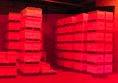 This is the inside storage building where the bees spend the winter and it looks eerie because of the red light which the bees don't see. For the two or so months they spend in the storage, the environment is kept totally dark (except for occasional use of the red light) and maintained at a nominal temperature of 40° F. Bees, like humans, create carbon dioxide and a lethal dose for them is just slightly more than normally found in the atmosphere; so the storage air environment must be constantly changed by special ventilation equipment to preclude a build up of carbon dioxide. Since the bees create heat, there is normally no need to heat the insulated facility and the greater concern is from it getting too warm. The bees survive the cold winter months, either indoors or outside, by clustering into a tight ball inside the hive on the beeswax comb containing their food source (honey). The consumed honey (a carbohydrate) produces heat and the cluster moves continuously - the inside bees moving out and visa versa. In this manner, none of the bees are on the outside of the cluster long enough to freeze and parish. The colder it is, the tighter the cluster - and at 40°, it's fairly loose. |