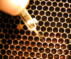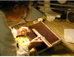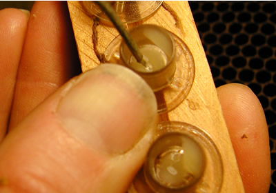 GRAFTING A few days after the queen lays an egg, it develops into a tiny larva, is fed by the nurse bees and begins to develop at the bottom of the cell in which the egg was laid. The larva must be removed from the cell and placed into a larger queen cup in order to develop a queen cell. Grafting is this process of removing the larva from the worker bee size cell and placing it in the queen cup. In order to graft efficiently, the breeder hive from which the larva are being taken must be managed by inserting an empty frame so the queen can lay enough eggs at one time to develop into a significant number of larva at the same age on a single frame. A one day old larva is about right for grafting but is so tiny as to be barely visible to the naked eye. Before starting to graft, a number of plastic or beeswax queen cups are arranged on a wood bar and each cup is primed with a small amount of royal jelly. Using a specially made grafting tool with an end that resembles a tiny flat spoon, the larva is lifted out of the worker bee cell of the frame and deposited into the queen cup. |