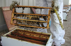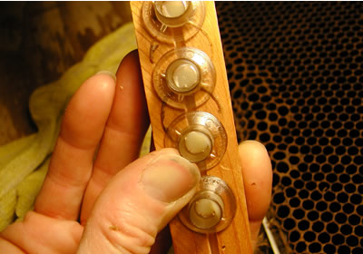 FINISHING CELLS Once the cups are grafted, the bars are assembled into a specially made frame and inserted into the cell builder hive. This is essentially a queenless hive with an abundance of young nurse bees pulled from other hives in a manner described on the previous page. The bees nurse and feed the larva and build the beeswax queen cell around it as it grows. After about 5 days the cells are capped and the frame is removed as shown. The capped cells are removed from the bar, transfered to a Styrofoam holder and placed in an incubator with controlled humidity and a temperature of 92°F for an additional 5 days. At this time, the cells are one to two days from hatching and are ready to go to the bee yard for placement into splits. An alternate to the incubator is to leave the cells in the queenless hive for the same period. However, this can be more problematic with cool night time temperatures in the early spring plus the fact that it is more efficient to use the bees for cell building - which can't be done anyother way.