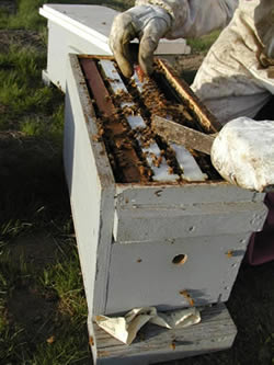 FINAL STEP Capped queen cells are extremely fragile. They must be kept upright at all times and the maturing queen pupa can be killed or damaged by the slightest shock or vibration. Cells are transported to the bee yard in the protective Styrofoam holder placed in a heated insulated cooler to provide a constant 92°F temperature. Individual cells are placed between frames in the queenless split for the bees to finish the job of incubation. The virgin queen chews her way out of the queen cell in a day or two and is instantly accepted by the bees, as any queen hatched in the hive would be. This is in contrast to the introduction of a mated queen obtained from another hive or purchased; as these are more likely to be rejected by the bees and killed. Even with the acceptance of the virgin queen, the nuc still doesn't have a queen until she is mated and laying. Mating flights can end in a meal for a bird or she can return to the wrong hive be rejected and killed. But, if all goes well, about two weeks after placing the cell, the split is a functioning colony with a laying queen. |
