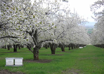 In late April and early May the bees have another pollination job in the Idaho and Oregon tree fruit orchards. Cherries (above), pears and apples all bloom this time of year and all require honey bee pollination. Weather conditions can be problematic for both the fruit grower and the bees. Rain for a week at a time in these orchards is not uncommon this time of year and can both starve the bees and ruin the fruit crop. As the bees finish their pollination duty they go on to more hospitable areas where lots of spring wild flowers bloom and we start working with the bees for this year's honey crop.