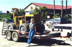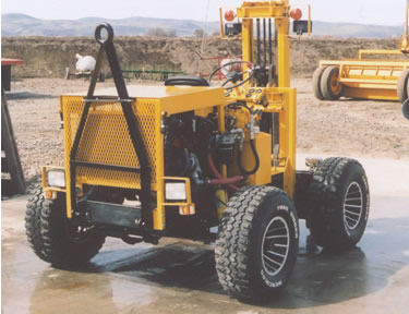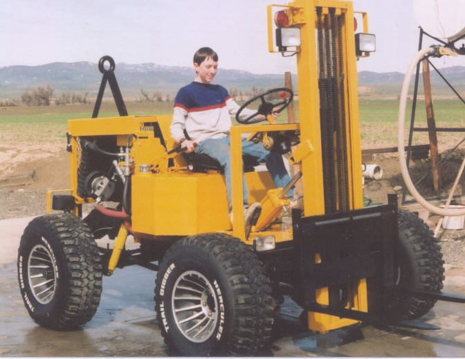 | What was the front (steer axle) of the Blaser is the back of the fork lift - reverse is forward and drive can go 100 mph - backwards! Although it never sees anything close to this it does zip around at 15 or 20 when necessary. Obviously, it isn't much help unless it goes with the truck and we started out using the tow bar to pull it behind the truck, but this soon gave way to a better method - hauling it on a trailer. | For moving bees, you need a fork lift with large tires for a smoother ride on rough ground, good ground clearance, all wheel drive, automatic transmission for constant forward and reverse and speed is helpful when spreading bees in an orchard. Short turning radius is another desirable feature. Shown here, the steeper angle of the engine keeps it short coupled for tighter turns. Lights are must as bees are usually moved at night. |