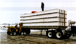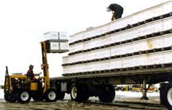 | The trailer makes it possible to take the fork lift when moving the bees out of state for pollination. This is January in Turlock, California - who wants to go back to winter! | When moving out of the orchard, bees are gathered and "banked" in stacks at the loading site the night before. This picture shows loading the next evening at dusk just as the bees finished flying for the day. | It only takes an hour or two to load tractor trailer truck and get it on its way if everything is organized and ready to go the night before. |