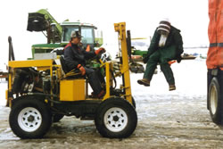| This picture shows us loading a tractor trailer out of storage in January for the trip from Idaho to the almond orchards in California. It's 35 Deg. and spitting snow, so the bees aren't much interested in flying. | Two pallets of bees weighs about 1,000 pounds and with the Blaser's 1/2 ton running gear the lifting limit isn't much over 1,500, but that's enough to do the job. | This fork lift has been in service since it was built over 15 years ago. It continues to move bees and people on a regular basis. |