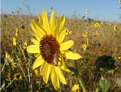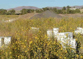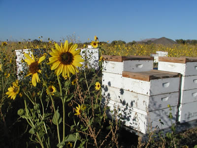 AN EXCEPTIONAL YEAR - SUN FLOWERS IN SEPTEMBER Two things make a really good honey year in our part of the country. First, is a wet Spring - the wetter the better. One of the best honey years we ever had was 1992 when it was so wet farmers couldn't get in some fields to plant their crops until May. The second thing, is getting those "out of character" rain showers in July or early August to bring on the Sun Flowers in September. You can see the results in these four pictures from this year! This part of Idaho is essentially a desert - receiving only about 11" of annual rainfall. If it weren't for irrigation from the surrounding mountain reservoirs the summers would be so dry there wouldn't be any agriculture or honey production to talk about. But the wild Sun Flower doesn't depend on irrigation like so many of our other wild flowers do, it's a lone survivor that flourishes when there is an exception to the rule of dry summer months. When it happens, as it did this year, we are rewarded with an abundant sun flower crop. This year, the main honey flow shut off in mid August as it usually does when most of the vegetation dries up. These pictures taken around the first week in September show what a few showers in July can do. A week or so after they were taken, the honey supers were removed to harvest the surplus honey, leaving just the bottom two boxes. Sun Flowers come a little late to help much with honey production, but they are a timely source of pollen and nectar for the bees this time of year. With the winter approaching, the bees need to keep their two boxes full with honey as they prepare for winter and the Sun Flowers along with other late blooming plants help provide these winter stores. |