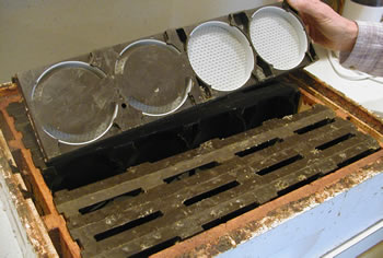 Once the frames are removed from the box, the frame halves can be split as seen in Fig 7. Note the original thin sheet of beeswax foundation is still connecting the individual sections. This excess is trimmed around the outside of comb sections prior to placing the plastic covers. Separate comb sections with the excess foundation material not yet trimmed are visible in the background. |