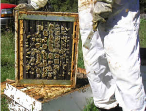 The production of attractive sections of comb honey is a learned art requiring a great degree of attention to detail. The hive or colony for comb honey production is managed through early spring by providing unrestricted space to give the queen plenty of room for brood production for build up of hive population before the honey flow starts. The comb honey super must be placed on the hive to concede with the start of the honey flow. If it is placed on the hive too early the bees have little motivation to build the comb and it can become discolored by the bees walking around on the foundation or partially built comb causing travel stains. But when placed on the hive just after the honey flow starts, the bees build the comb immediately because it is needed to contain the abundance of honey. The colony is reduced to a single deep box when the comb honey super is added further restricting the available space in the hive providing additional urgency to draw out the comb. In this manner, the comb is built and filled rapidly to minimize the likelihood of staining or discoloration of the wax comb. Fig 3 shows the finished comb honey super being removed from the hive just after the fume board was removed. The fume board is used to remove the bees from the super and is still visible on the second hive to the right in this picture. Plastic frames described earlier are can be seen in Fig 4 from the bottom of the super and in Fig 5 from the top. There was a "Comb Honey" era from the period of around 1880 to 1920 during which time most beekeepers produced comb honey. Consumers in that time preferred comb honey to liquid honey because they understood it was a pure, natural product. As late as 1950 some beekeepers were still producing only comb honey but, because it is cheaper and easier to produce liquid honey, comb honey production has declined and has almost become a thing of the past. Today, comb honey has become somewhat of a delicacy but, those who prefer "raw" honey in the strictest sense of the word will find no other source of honey that is literally untouched by anyone other than the bees. |