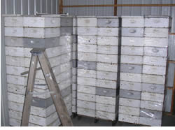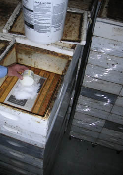 IS IT MAY OR SEPTEMBER - ? We had the same picture of the supers earlier in the Spring - but they were going out then - and they are coming back now. The photo (Fig 2) shows how they are stacked tight together on a solid bottom pallets, which are actually the drip pallets used earlier in the season for pulling honey in the bee yard. The beeswax comb in the frames of the supers is delicate and must be protected while in storage. There are two principal concerns when storing any drawn beeswax comb - mice and wax moths. The solid bottom pallets do a good job of sealing off the bottom of the stacks keeping out the mice which like to nest in the boxes over the winter and, yes - eat the comb. But the most serious damage to stored combs comes from the wax moth. The adult moth has the ability to enter the hive at night to lay their eggs on the comb. The eggs hatch into larva that feed on the wax comb. Comb in a populated bee hive is protected by the bees who quickly kill and dispose of the wax moth larva as they hatch. Stored comb must be protected by special moth ball like crystals that are placed in the top of the stack of supers as shown in the picture at right (Fig 3). As the crystals evaporate, the gas released is toxic to both the moth as well as any larva which may be hatching in the stored comb. It does not, however, affect the viability of the eggs. Only extreme temperatures above 150° F or below -20°F will kill the eggs. However, the eggs don't hatch when the temperature cools off in the late Fall and Winter, so the protection is most critical during the warmer weather. |