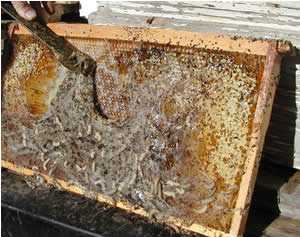 Devastation of wax comb by wax moth larva.